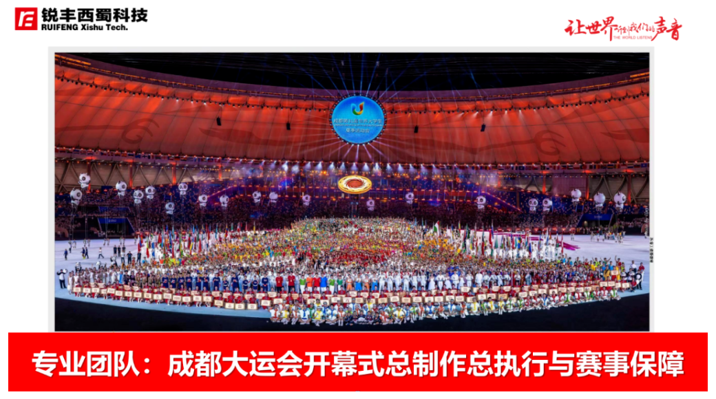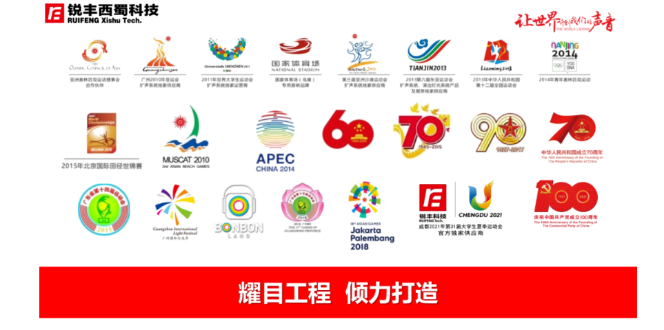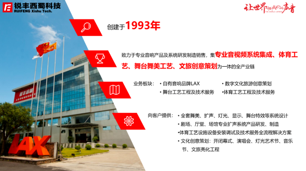 目前,锐丰西蜀科技在政府项目,体育场馆,剧场剧院、户外公共广播,智慧教育,酒店工程等多个领域长期提供专业优质系统服务,其业务范围包含全套舞美、扩声、灯光、舞台特效等相关系统的设计;专业音响及扩声系统产品研发、制造;安装调试、系统运维及技术服务全流程一体化解决方案;文化创意策划-开闭幕式、演唱会、灯光艺术节、音乐节、文旅亮化工程。坚持致力于重安全、保质量、优服务、创一流的精品工程。