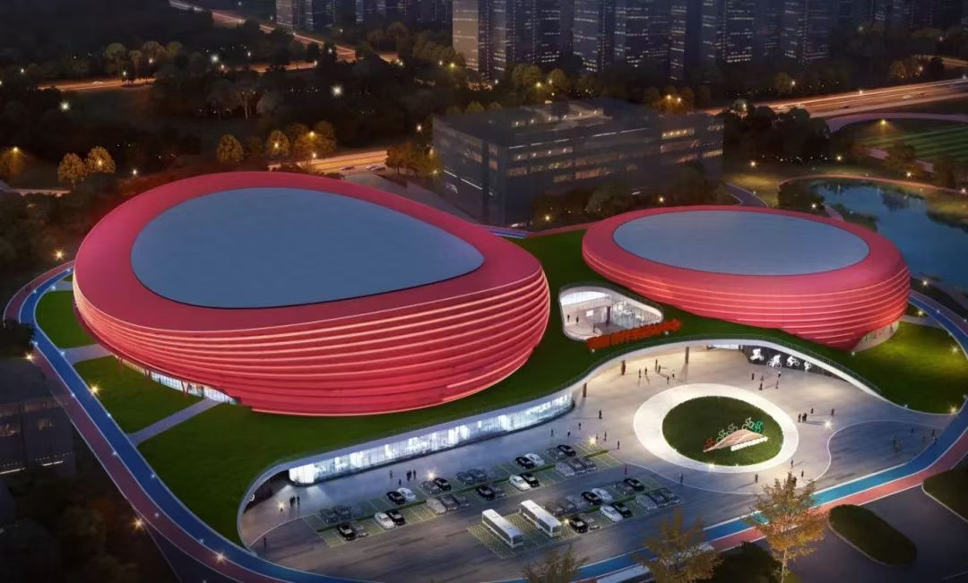 其平面轮廓由两个圆形场馆组成,与早期自行车的大小轮相呼应,建筑立面融入“灯”及“赛道”元素,整体造型优雅简洁。