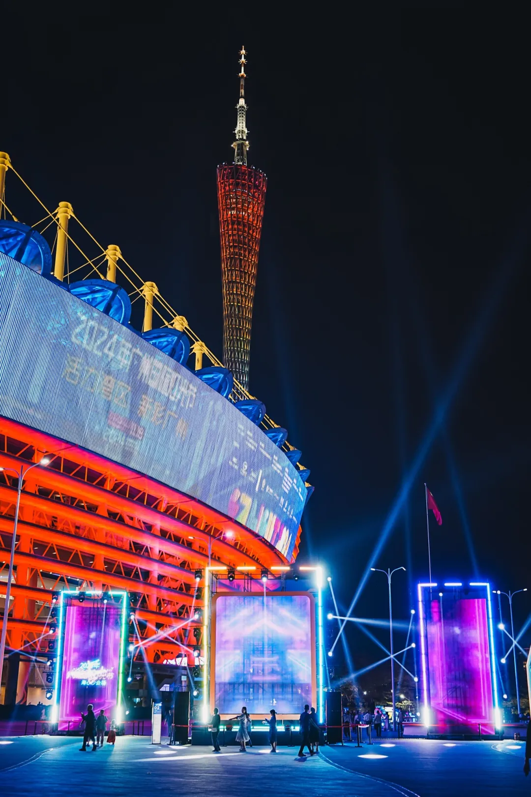 当晚,亮灯仪式在新中轴主会场启动,位于花城广场南广场的动态灯光装置作品与广州塔首次联合,
